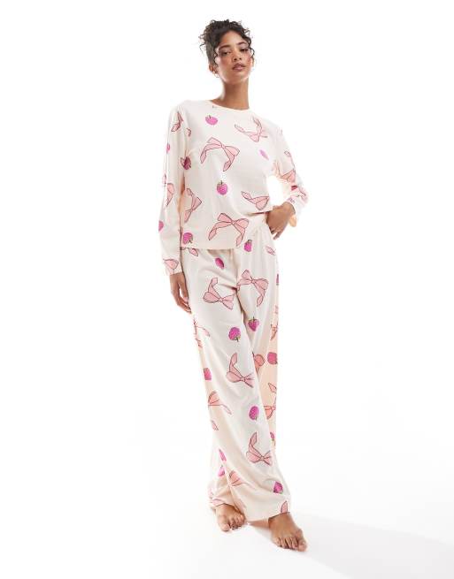 ASOS DESIGN bow and fruit long sleeve top & pants pyjama set in pink