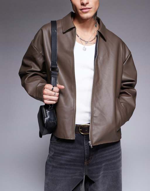 ASOS DESIGN boxy oversized faux leather harrington jacket in brown