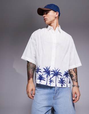 ASOS DESIGN boxy oversized linen look shirt with palm tree print in white