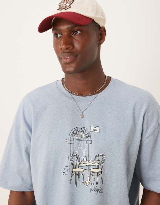 ASOS DESIGN boxy oversized linen look t-shirt with cafe graphic in light blue