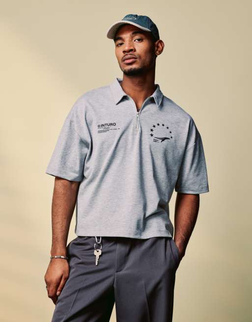 ASOS DESIGN boxy oversized zipped polo with sports graphic in grey marl rib