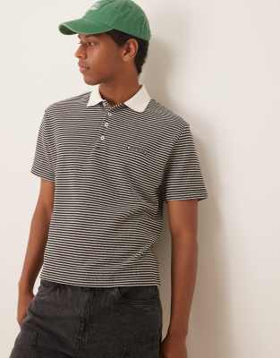 ASOS DESIGN boxy relaxed polo shirt in cream and black texture stripe with chest embroidery