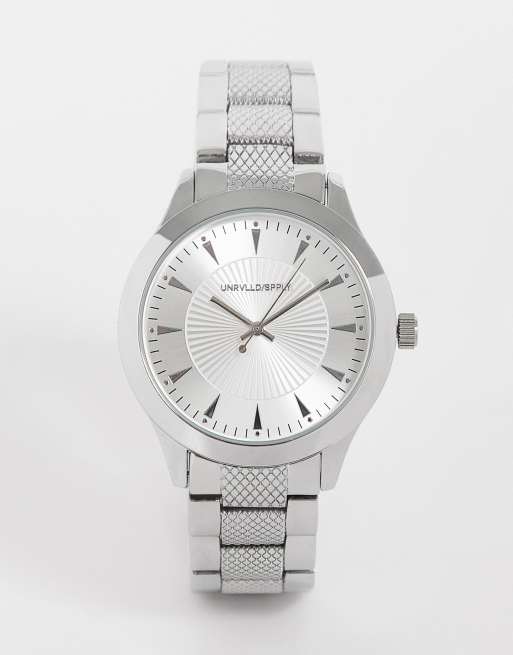ASOS DESIGN bracelet watch with strap detail in silver with gunmetal face with line detail texture