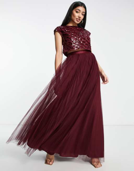 ASOS DESIGN Bridesmaid pleated tulle maxi skirt with ribbon waist in wine (part of a set)