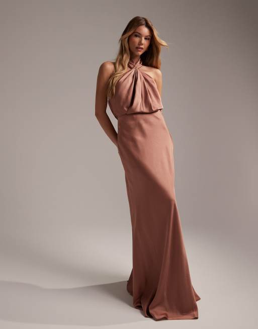 ASOS DESIGN Bridesmaid satin ruched halter neck maxi dress in cinnamon rose