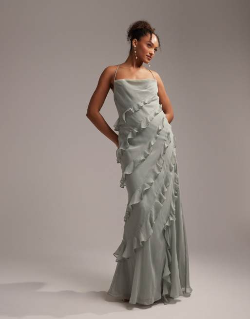 ASOS DESIGN Bridesmaids ruffle cami bias maxi dress in sage green