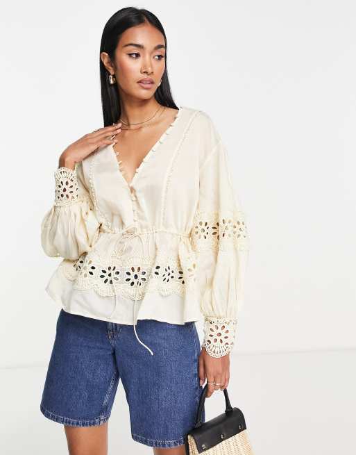 ASOS DESIGN button front blouse with crochet trims and volume sleeve in antique cream