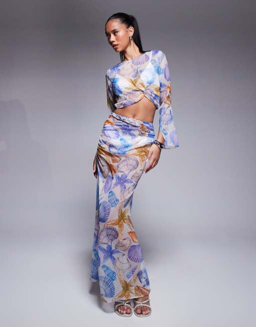 ASOS DESIGN chiffon maxi skirt & long sleeve chiffon crop top set in shell print