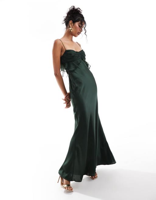 ASOS DESIGN chiffon satin mix frill detail maxi dress with tie back in forest green