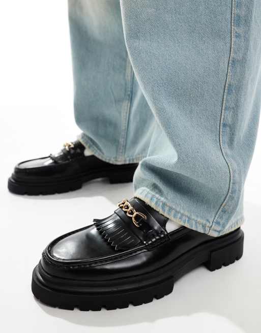 ASOS DESIGN chunky loafers in black leather with fringe and snaffle