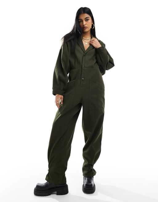 ASOS DESIGN collared boilersuit with button detail leg in khaki