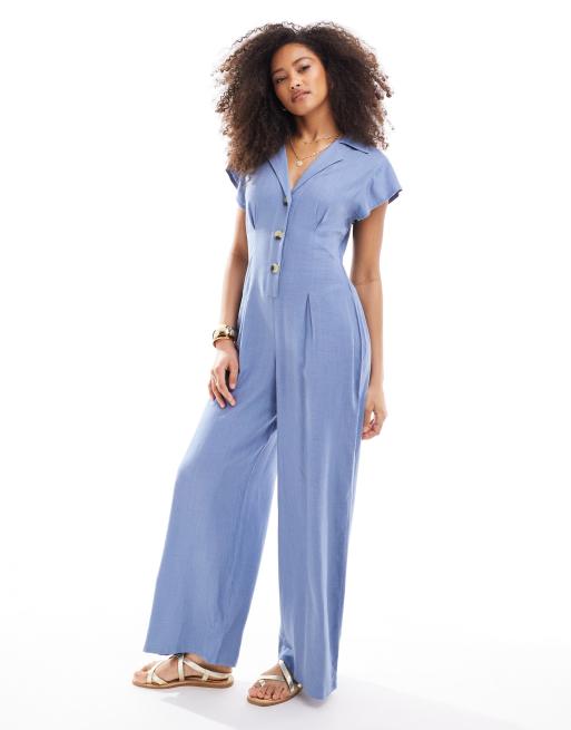 ASOS DESIGN collared linen look button through jumpsuit in blue
