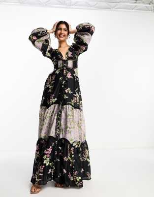 ASOS DESIGN colourblock maxi dress with blouson sleeves in multi floral print