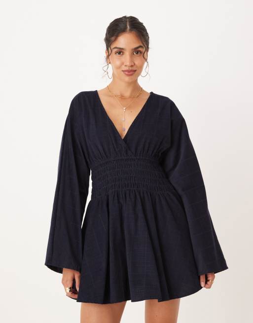 ASOS DESIGN cord v neck mini dress with shirred waist in inky blue