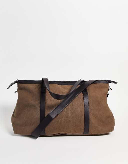 ASOS DESIGN cotton canvas weekend holdall with leather straps in khaki