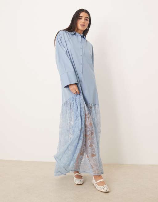 ASOS DESIGN cotton shirt with lace skirt maxi dress in smoky blue