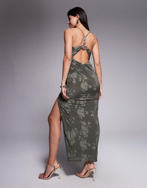 ASOS DESIGN cowl burnout halter maxi dress with gold hardware in khaki