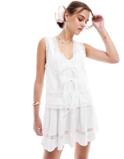 ASOS DESIGN crinkle double layer mini dress with lace insert and tie front in white
