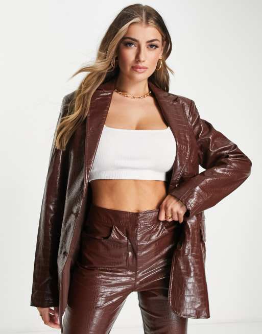 ASOS DESIGN croc leather look suit blazer in brown