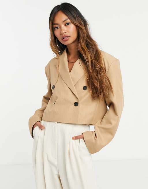 ASOS DESIGN crop strong shoulder suit blazer in camel