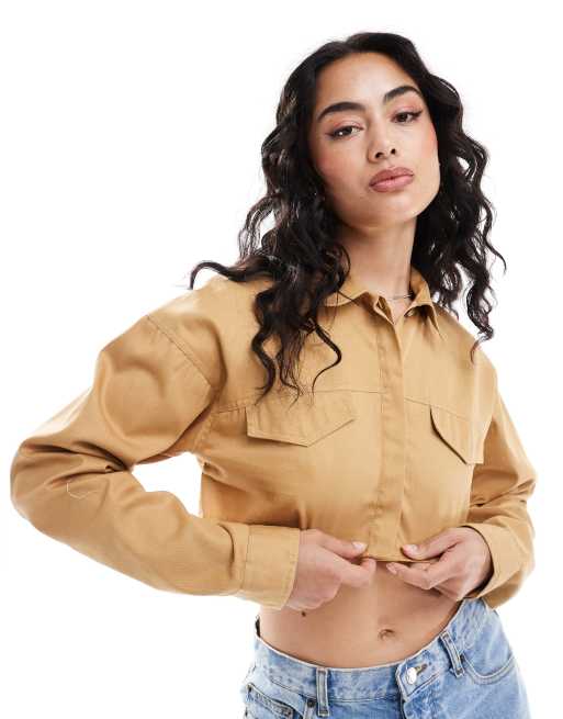ASOS DESIGN cropped cargo shirt in camel