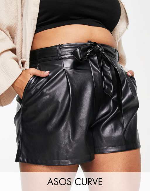 ASOS DESIGN Curve leather look paperbag waist shorts in black