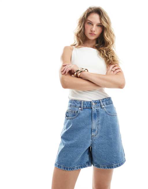 ASOS DESIGN dad denim shorts with cinch back in clean blue