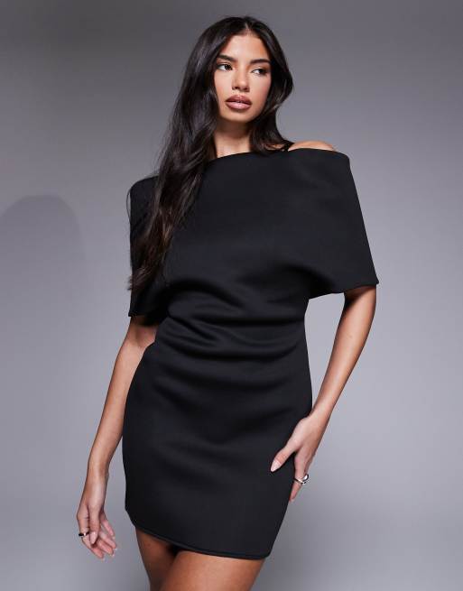 ASOS DESIGN deep bardot mini dress with cape back detail in black scuba-style fabric