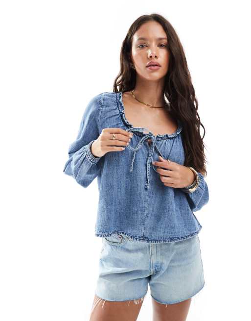 ASOS DESIGN denim balloon sleeve blouse with linen in midwash blue