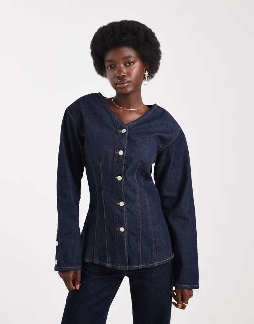 ASOS DESIGN denim high v -eck cinch shirt with shoulder pads in indigo