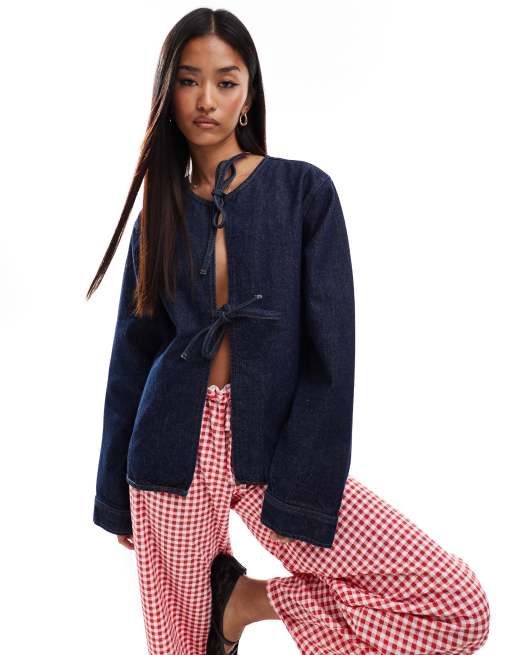 ASOS DESIGN denim long sleeve tie front top in indigo