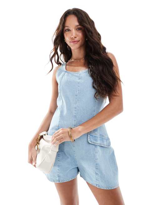 ASOS DESIGN denim scoop neck playsuit with pocket detail in light mid blue