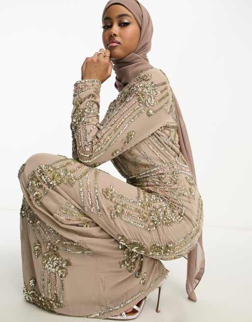 ASOS DESIGN double layer maxi dress with floral embellishment in taupe