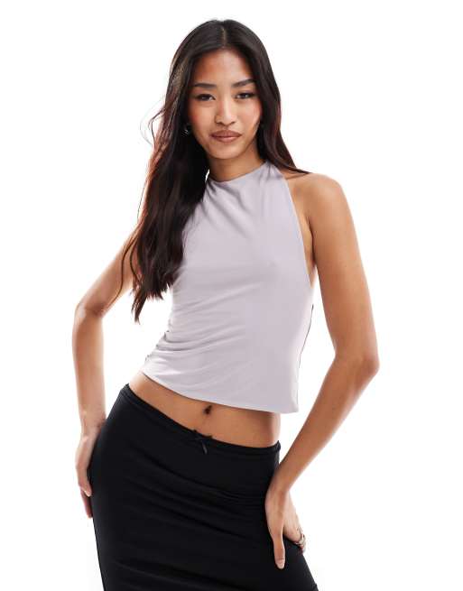 ASOS DESIGN double layer slinky tie neck halter top in grey