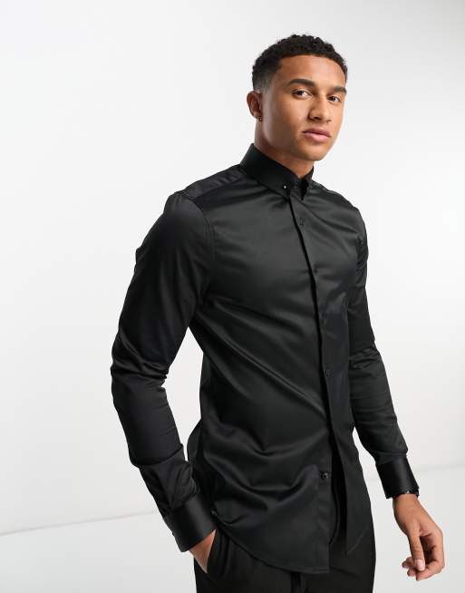 ASOS DESIGN easy iron slim sateen shirt with collar bar in black