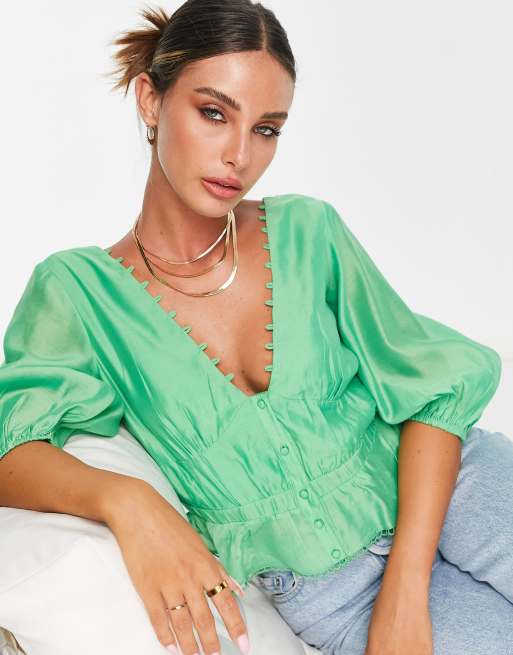 ASOS DESIGN elastic waist blouse with peplum hem & button detail in green