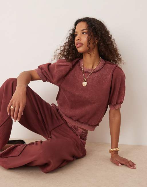 ASOS DESIGN exposed seam short sleeve sweat tee in washed burgundy (part of a set)