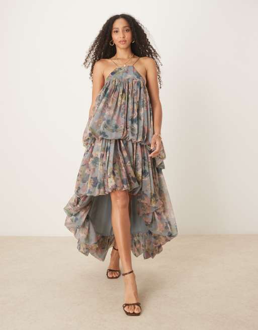 ASOS DESIGN extreme double puff strappy maxi dress with hi lo hem in floral print