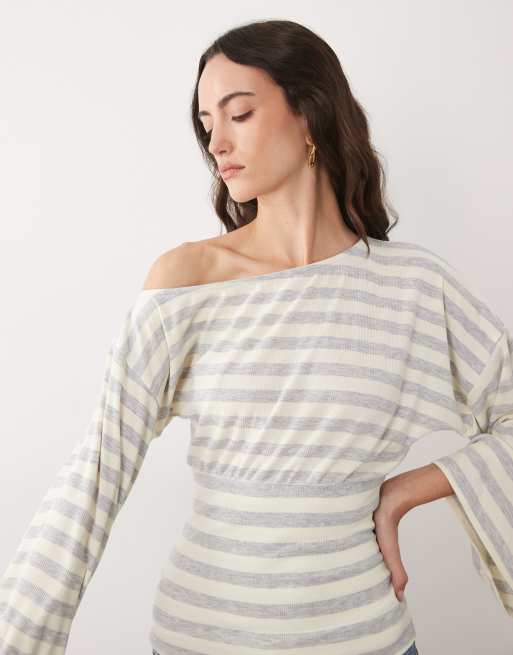 ASOS DESIGN fallen shoulder cinched waist top in grey and ecru stripe