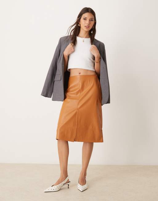 ASOS DESIGN faux leather split front midi skirt in tan