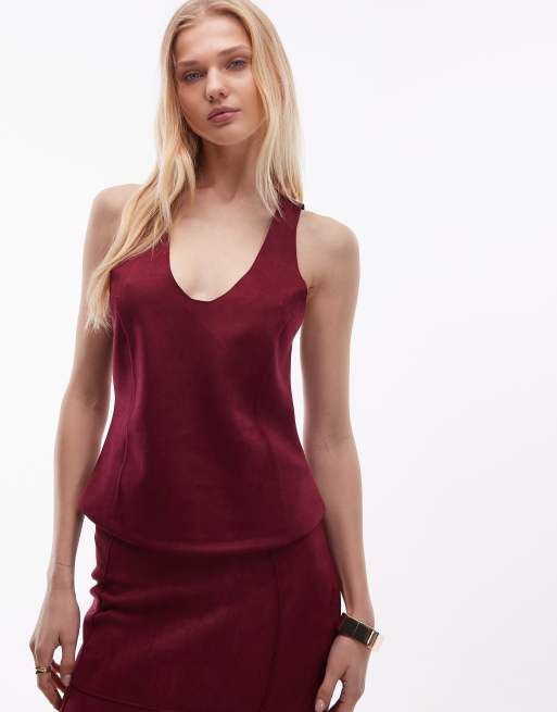 ASOS DESIGN faux suede low scoop racer back top in burgundy (part of a set)