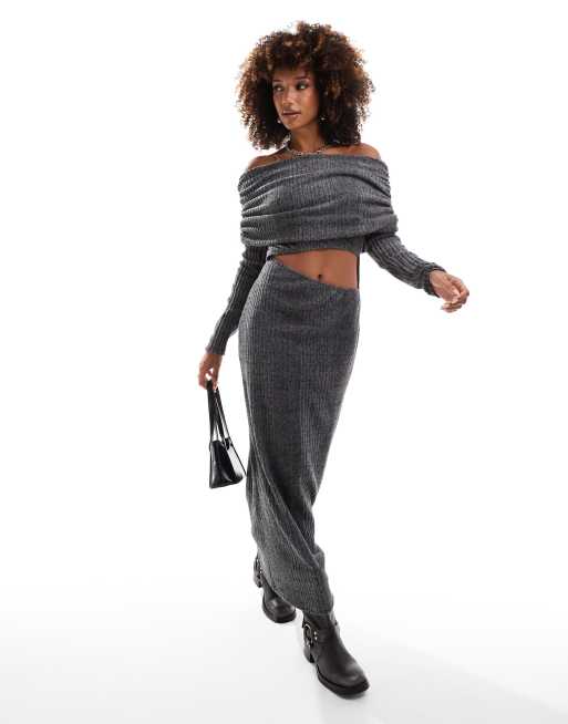 ASOS DESIGN fluffy ribbed bardot faux-ord midaxi dress in charcoal marl