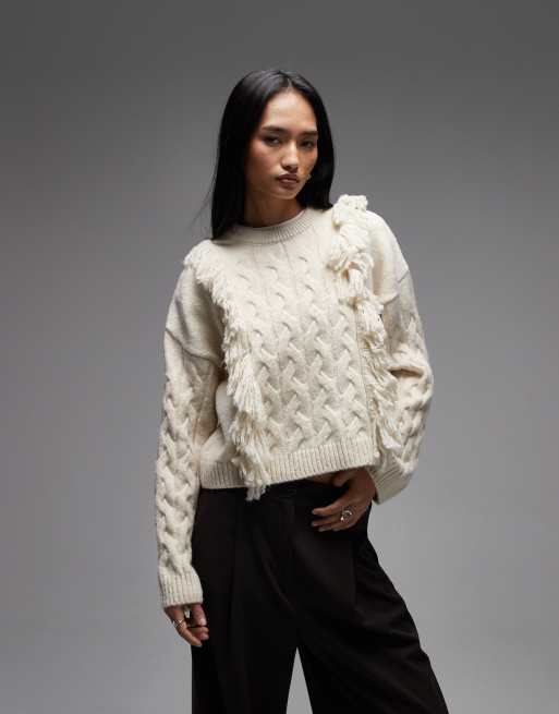 ASOS DESIGN fluffy tassel cable knit jumper in ecru