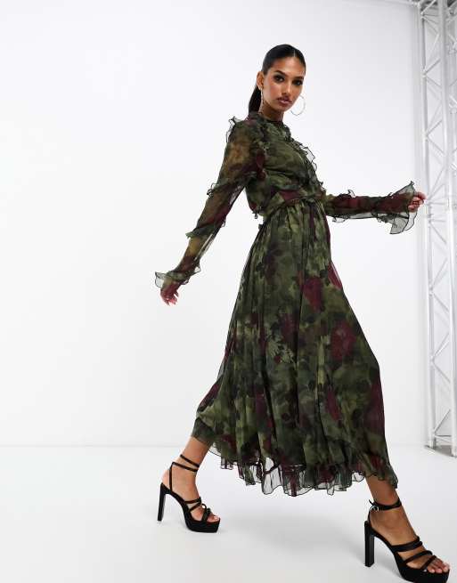ASOS DESIGN frill midi dress with button detail in green floral print