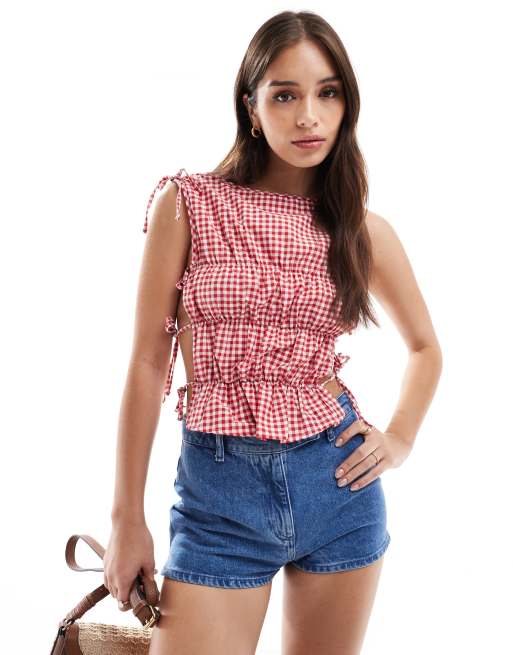 ASOS DESIGN gathered tie side tank top in red gingham