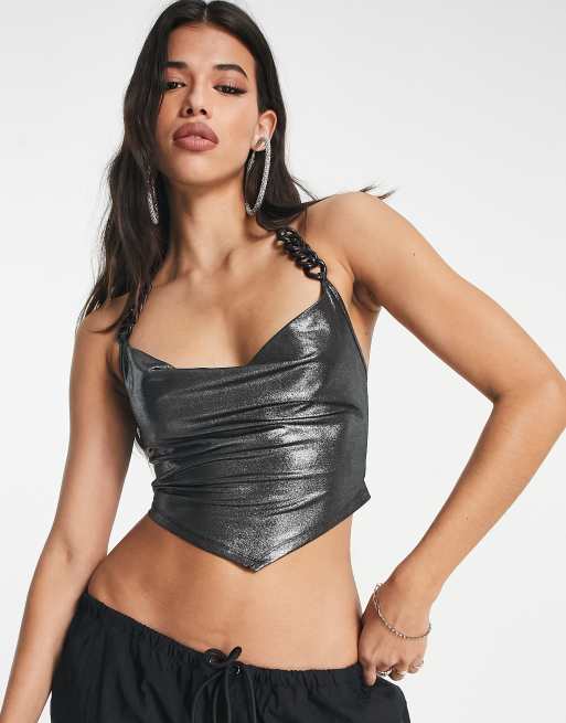 ASOS DESIGN halter crop top with chain strap in metallic