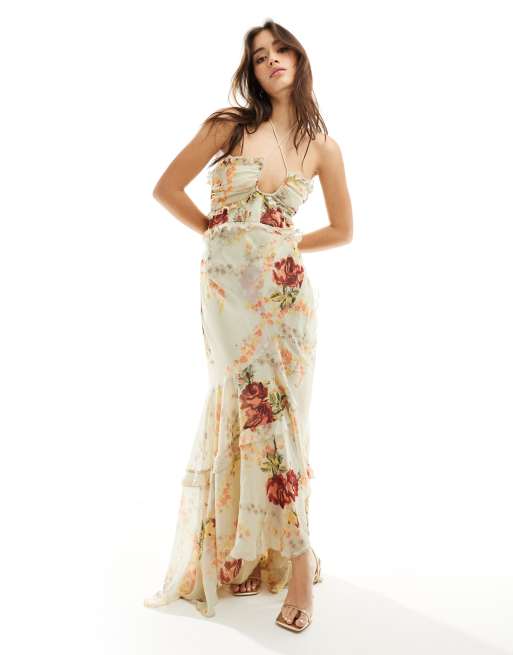ASOS DESIGN halter ruffle maxi dress with high low hem in cream floral print