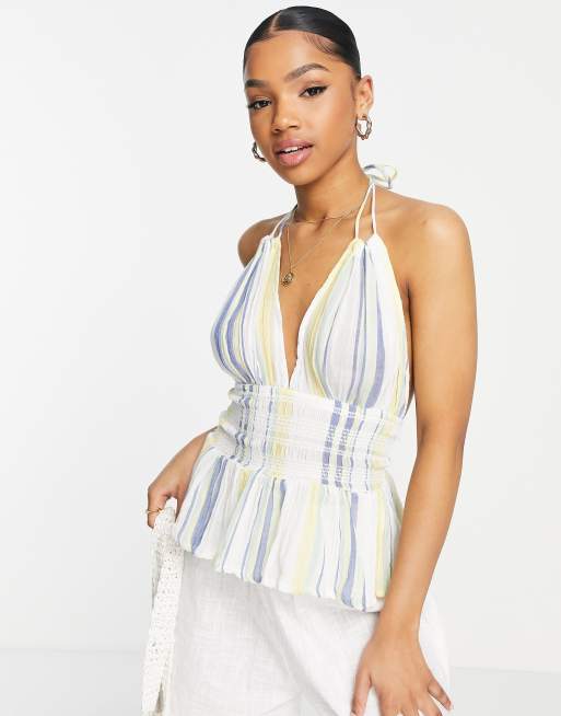 ASOS DESIGN halter sun top with shirred waist in stripe