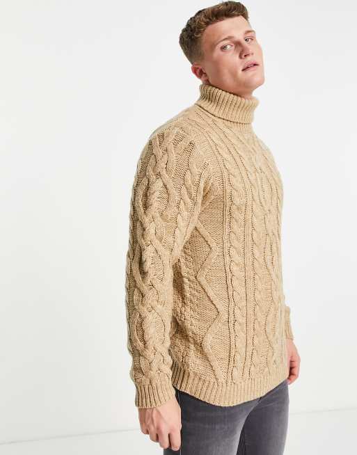 ASOS DESIGN heavyweight cable knit roll neck jumper in light tan