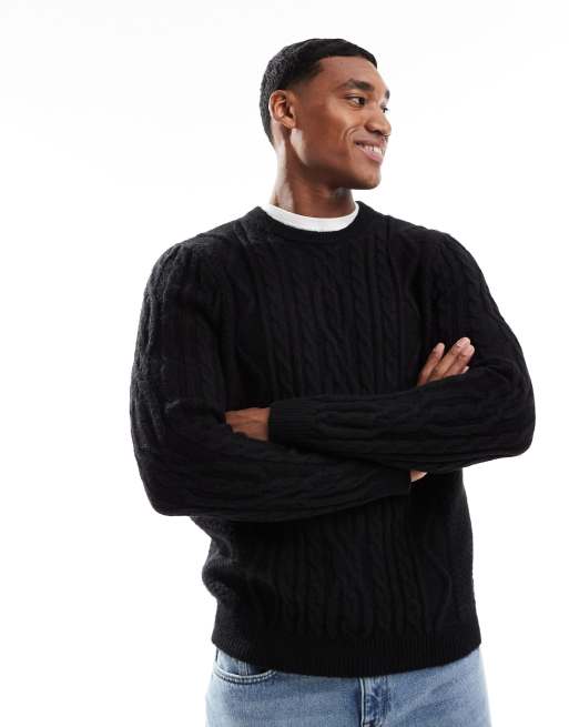 ASOS DESIGN heavyweight cable knitted crew neck jumper in black